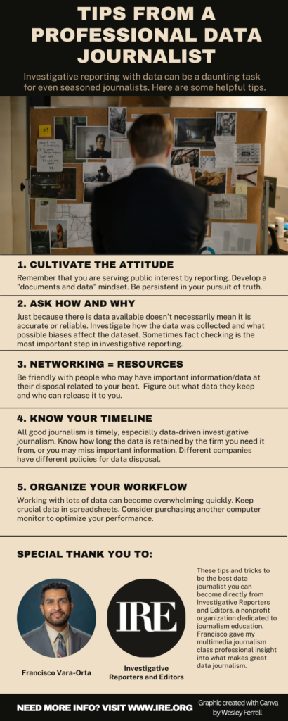 Francisco Vara-Orta was a guest speaker on Feb. 7 in my Multimedia Journalism class for a workshop on data journalism. I’ve created an infographic summarizing some of the professional insight he shared with us.